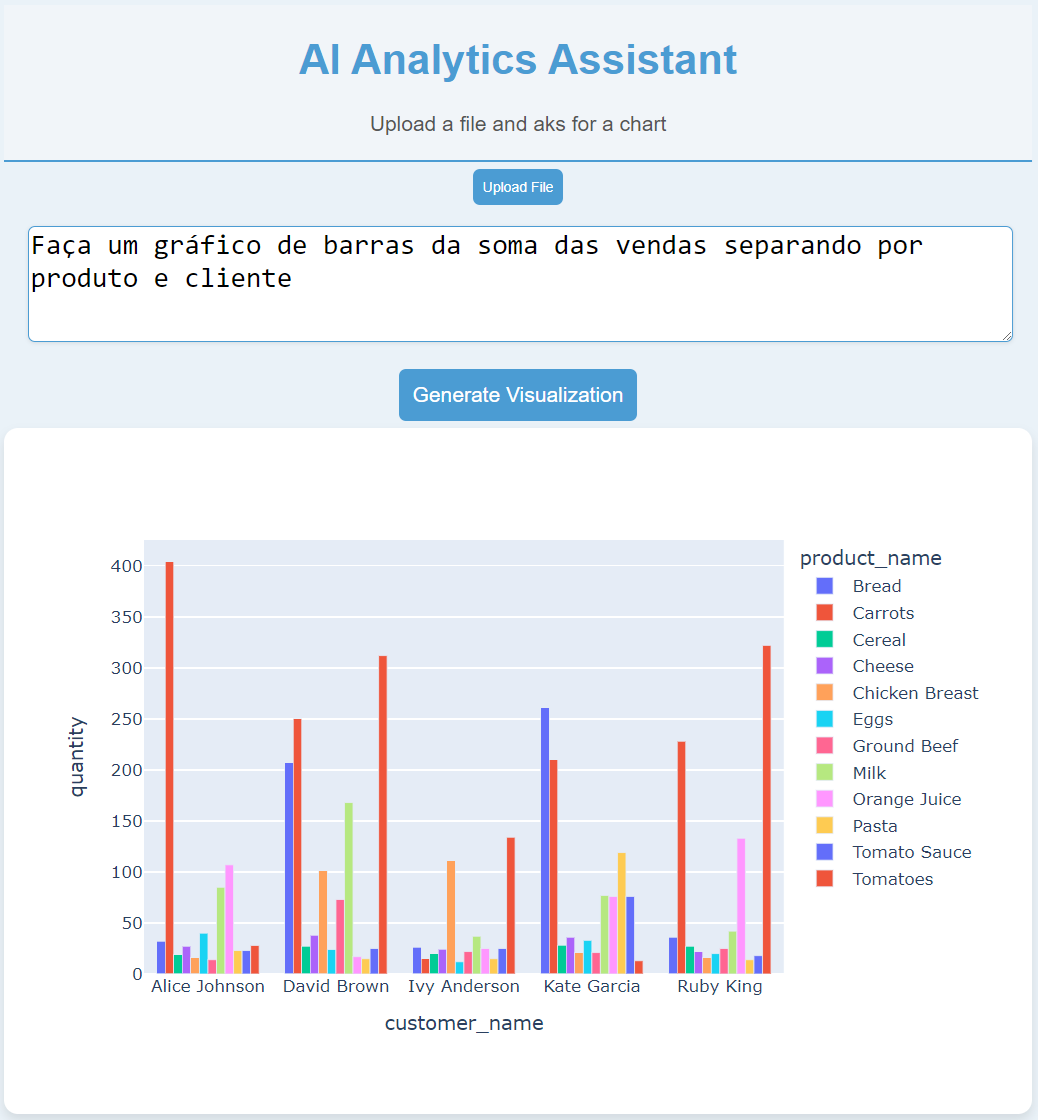 Desenvolvi um assistente de análise com IA que permite aos usuários gerar gráficos personalizados a partir de arquivos CSV ou XLSX com comandos simples, como "Crie um gráfico de pizza das compras por produto". A ferramenta agiliza a visualização de dados e facilita a tomada de decisões rápidas, sem a necessidade de conhecimentos técnicos avançados.